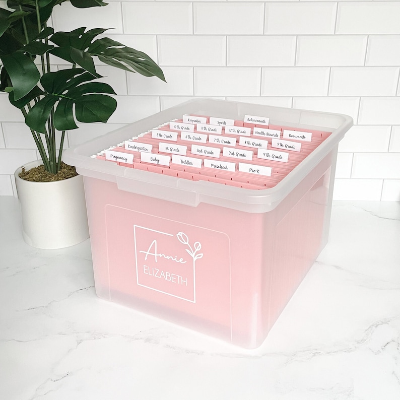 - Milestone File Box: This option is perfect for my Type A moms. Your file box can be customized with different folders such as infant, toddler, PreK, etc. or you can create folders for artwork, school pictures, awards and so on. The possibilities are endless.